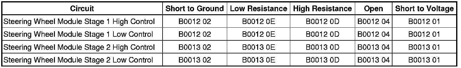 The steering wheel module high and/or low circuit is short to voltage for 120 milliseconds.