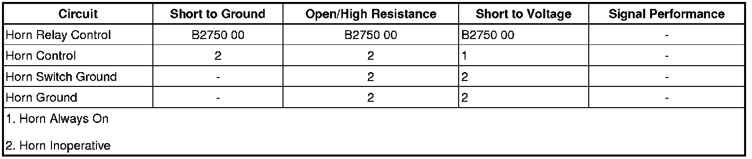 The BCM detects a short to ground, open, or short to voltage in the horn relay control circuit for approximately 125 milliseconds.