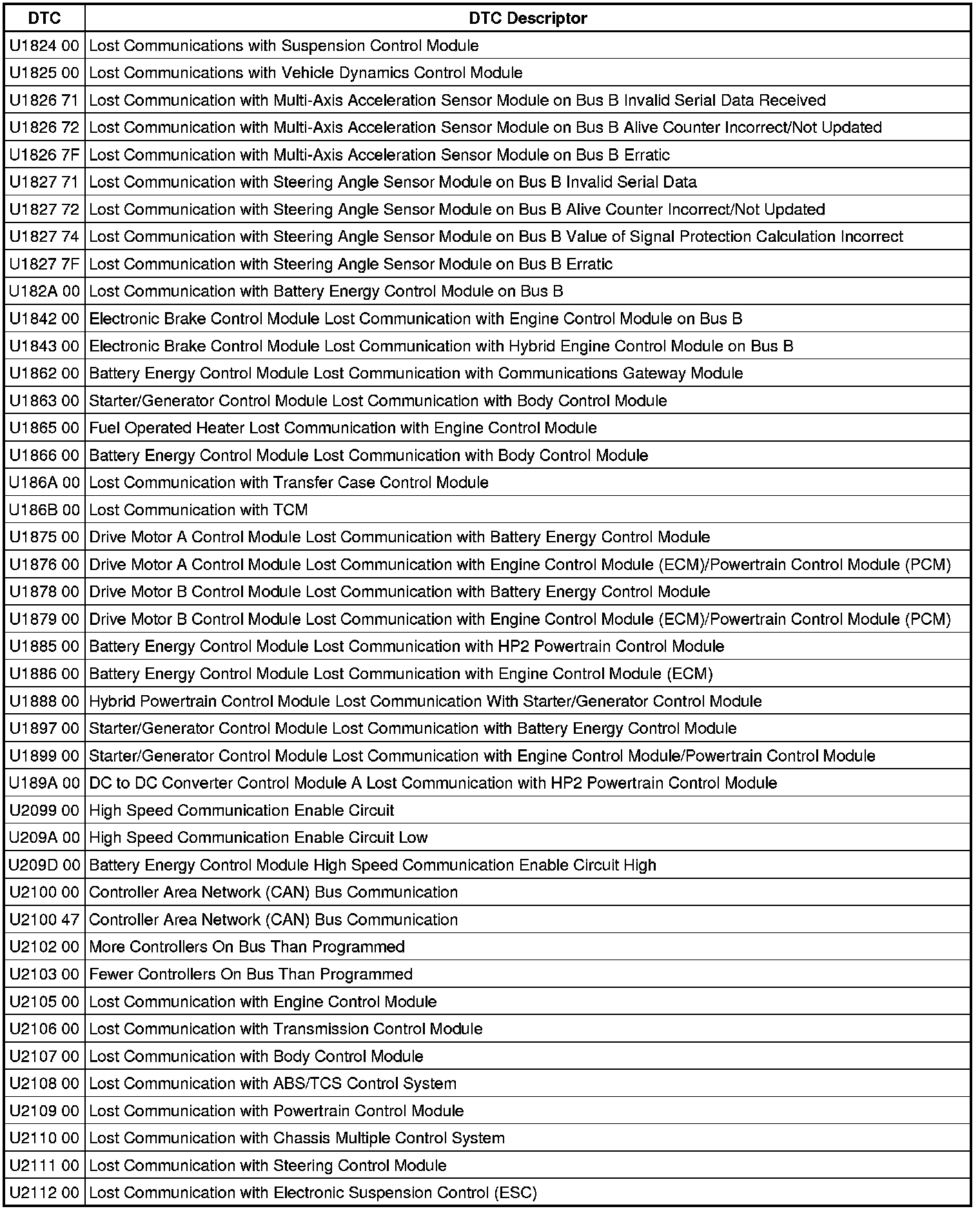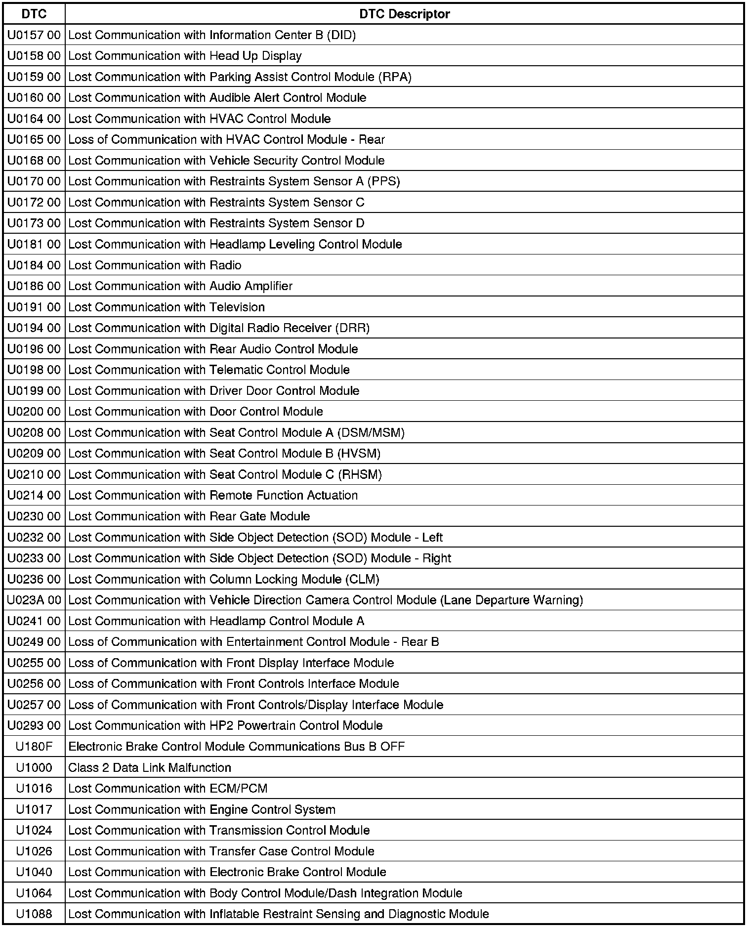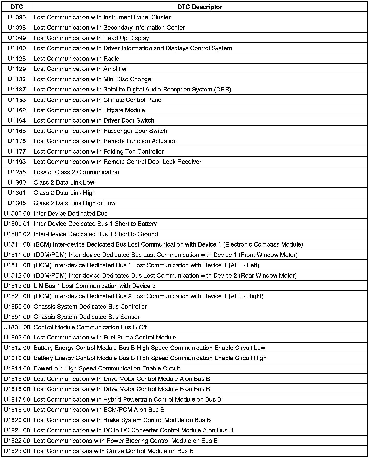 This list includes all Data Communications related U-code DTCs in alphanumeric order with descriptors for all modules. Not all DTCs listed will be applicable to all vehicles.