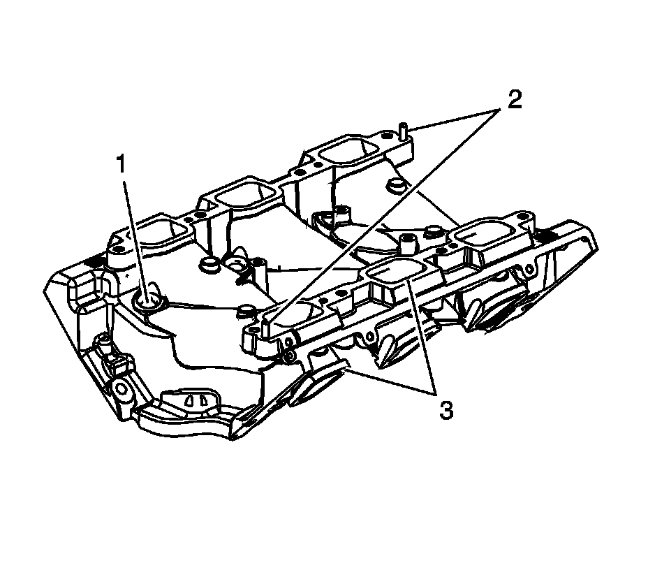 1. Clean the intake manifold gasket mating surfaces (3) using GM P/N 12346139 (Canadian P/N 10953463) or equivalent.