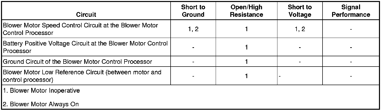 The blower motor control module is an interface between the HVAC control module and the blower motor. The blower motor speed control, battery positive and ground circuits enable the control module to operate. The HVAC control module provides a variable voltage signal to the blower motor control module to request the selected blower speed. The blower motor control module provides a pulse width modulation (PWM) ground signal to the blower motor in order to control the blower motor speed. The module supplies 12 volts to the blower motor through the blower motor voltage supply circuit.