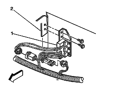 1. Position the headlamp flasher (1) to the front radiator support (2).