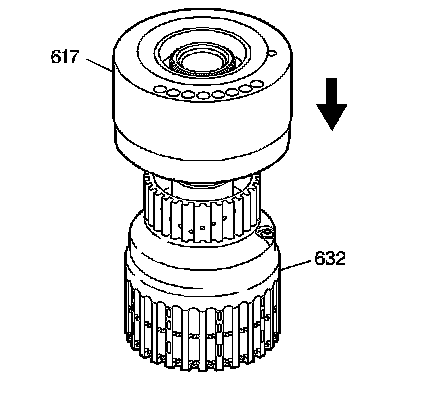 7. Use J 33381-A - remover/installer in order to lift the input and second clutch housing assembly (617, 632). The sprag clutch assemblies will also be attached.