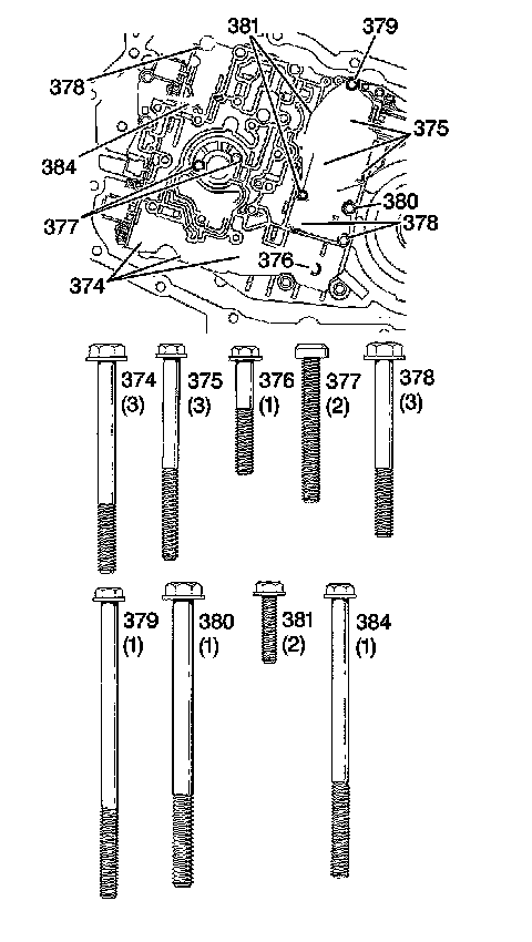 5. Install the valve body bolts (374-381, 384).
