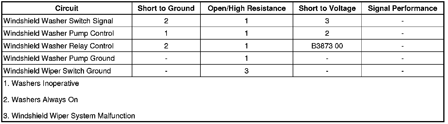 * Test the windshield washer switch signal circuit for an open/high resistance. If the washer switch and circuit test normal, test or replace the body control module.