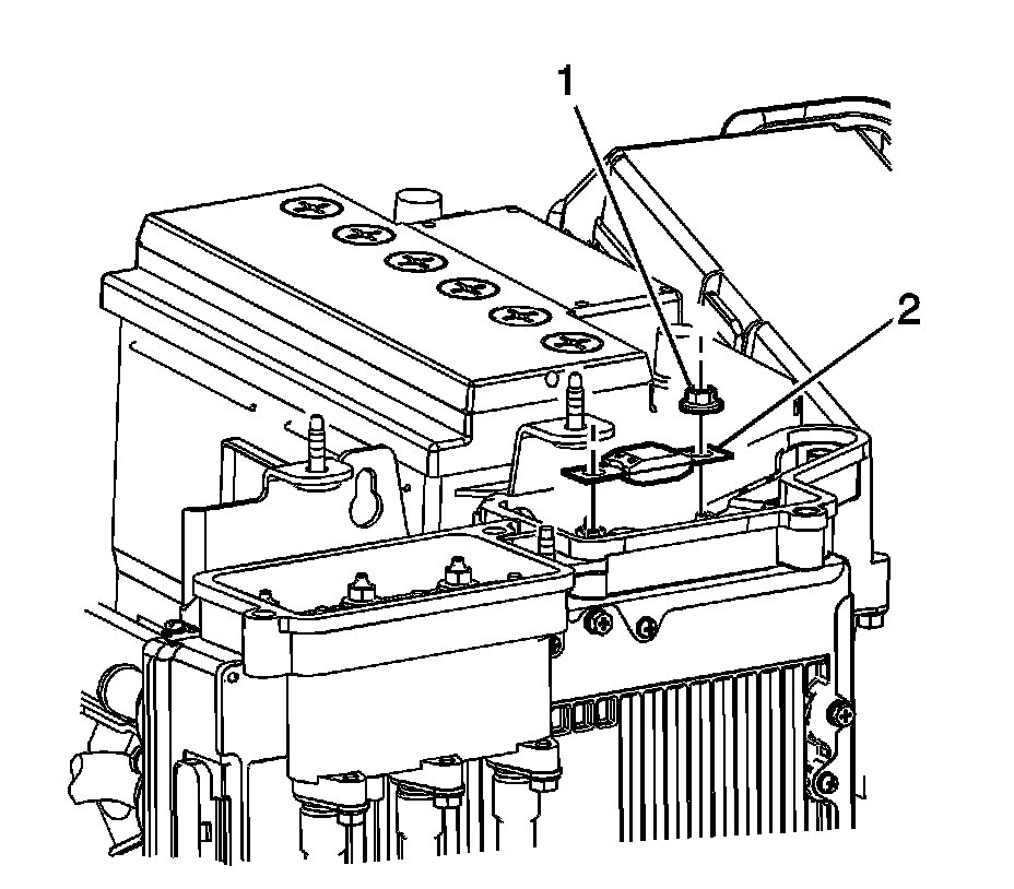 5. Remove the generator control module bracket reinforcement bolt (1) and nuts (2).