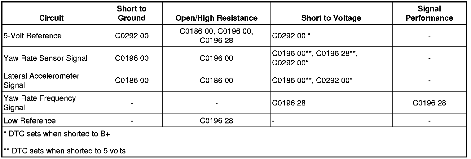 * The EBCM detects a short to B+ on either the yaw rate signal circuit or the lateral accelerometer signal circuit.