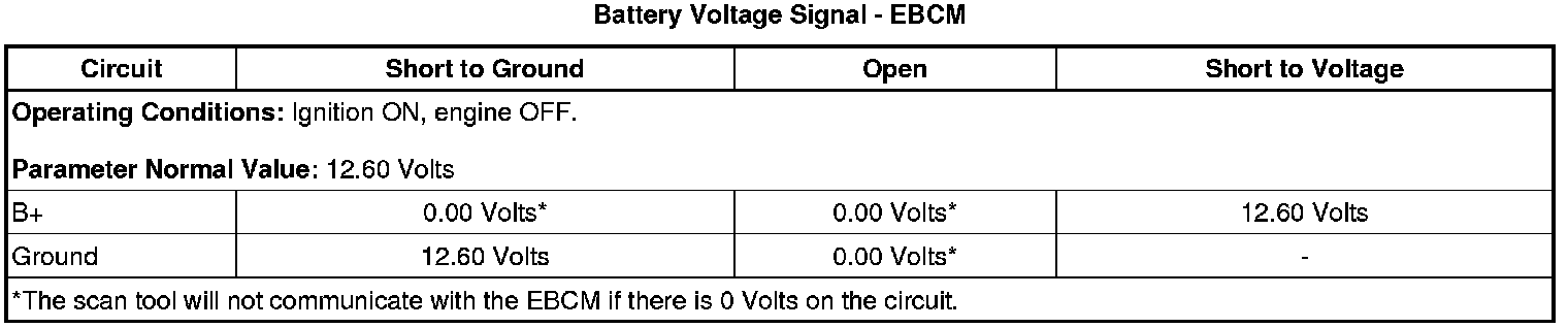 2. Observe the scan tool EBCM Battery Voltage Signal parameter. The reading should be between 12.60 and 15.00 volts.