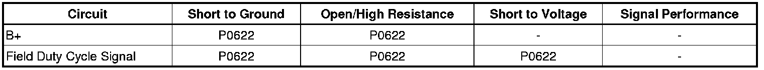 * The DTC will pass when the generator field duty cycle signal is greater than 5 percent for 1 second.