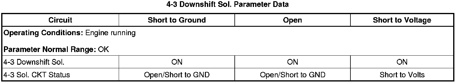 2. Ignition ON, engine OFF, observe the 4-3 Sol. CKT Status parameter while commanding the 4-3 downshift solenoid ON and OFF with a scan tool. The reading should display OK or Indeterminate.