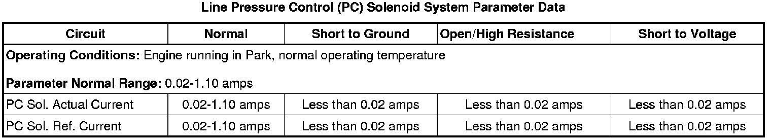 The pressure control (PC) solenoid valve is an electronic device located in the valve body. The transmission control module (TCM) controls transmission line pressure by regulating the current flow through the PC solenoid valve windings. The TCM determines the appropriate line pressure for a given load by monitoring the throttle position sensor voltage, the engine speed and other inputs. The TCM then varies the duty cycle on the high side of the PC solenoid valve to control current flow to the solenoid. The magnetic field produced by the coil moves the solenoid's internal valve which varies pressure to the pressure regulator valve. The TCM controls the PC solenoid valve by applying a varying amount of amperage to the solenoid. The applied amperage can vary from 0.1-1.1 amps. Low amperage, 0.1 amp, indicates high line pressure. High amperage, 1.1 amps, indicates low line pressure. The duty cycle of the PC solenoid valve is expressed as a percentage of energized ON time. Zero percent indicates zero ON time, non-energized, or no current flow. Approximately 60 percent at idle indicates maximum ON time, energized, or high current flow. Current is controlled from about 0.02 amp for maximum line pressure to 1.1 amps for minimum line pressure. The TCM monitors the actual current to the solenoid as compared to the requested or reference current.