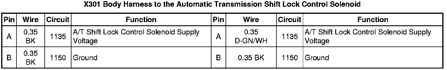 X301 Body Harness to the Automatic Transmission Shift Lock Control Solenoid
