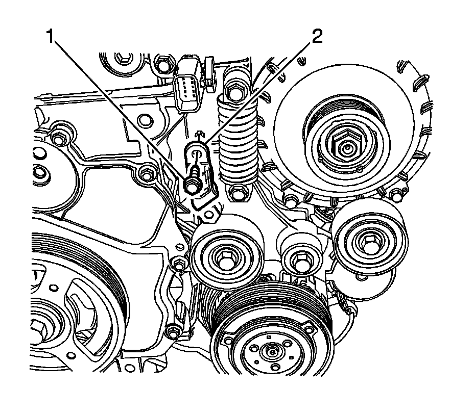 2. If equipped, remove the tensioner stop fastener (1) and stop (2).
