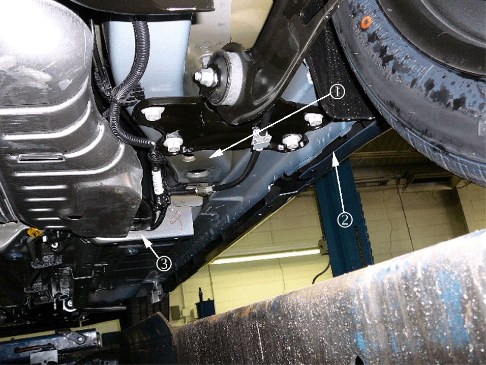 To avoid this situation, particularly when using the type of hoist where the arms swing in and the pick up pads swivel, be sure of the placement of the pick up pads. If the pick up pads are not positioned correctly to the underbody pick up areas, this type of damage may occur.