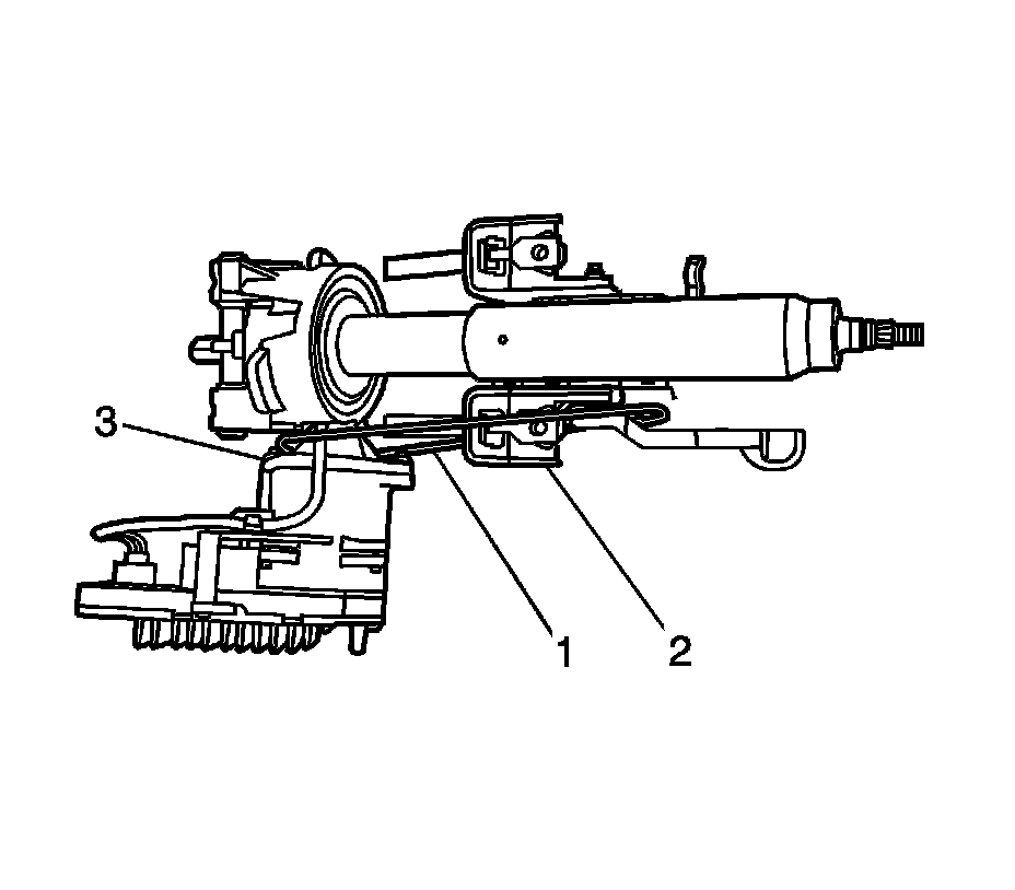 Note: Install tie straps (1) between the tilt lever bracket (2) and the neck of the power steering assist motor (3) to prevent the steering column jacket from pulling apart. The tilt lever MUST be in the LOCK (FULL UP) position during the steering column removal and installation to ensure that the tilt lever bracket remains rigid. Also install tie straps around the tilt lever and the steering column jacket to keep the tilt lever in the LOCK position. Do not bend the steering column energy absorbing straps located on the steering column upper bracket.