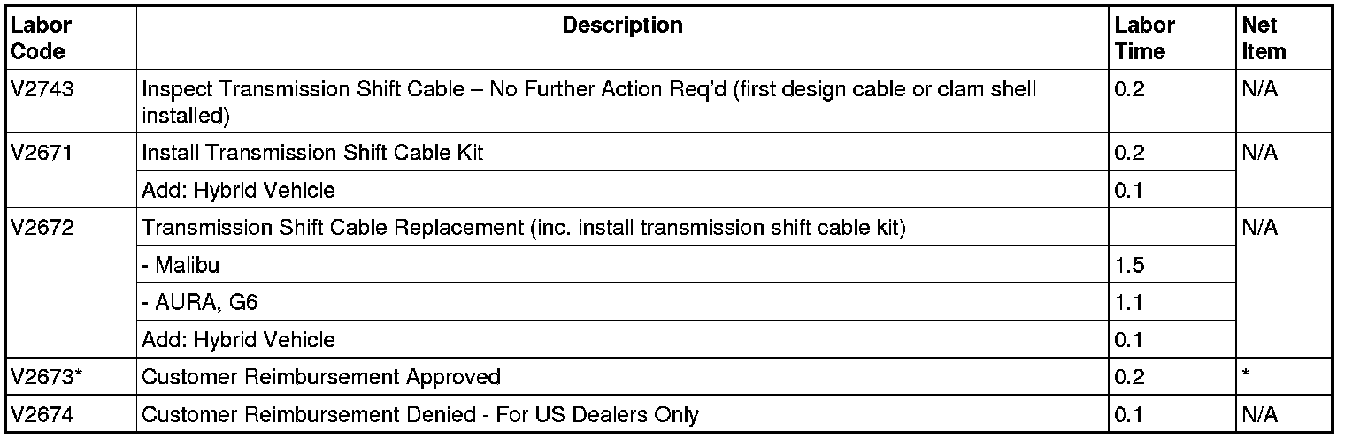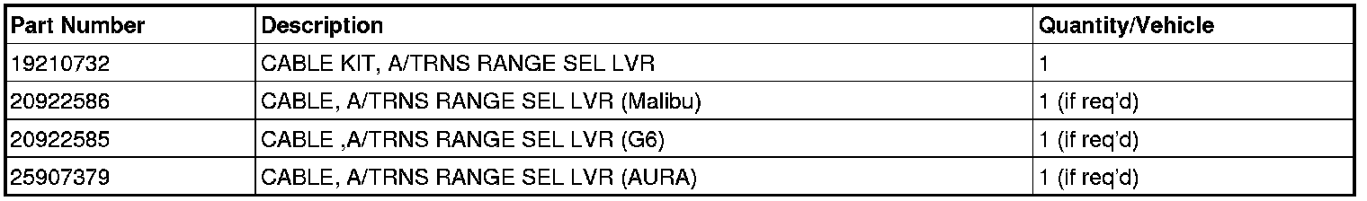 The suspect transmission shift cables involved in this recall were also sold to customers as service replacement parts. Our records indicate that a small number of vehicles were repaired by GM dealers with suspect cables sold as service replacement parts. These vehicles were not included in the original recall and have been added to the involved vehicle population. They require completion of the service procedure described in this bulletin. Additional vehicles may have been repaired with suspect cables sold as service replacement parts but VIN information is not available. Included in this bulletin is a "Safety Recall Notice" for public display at your dealership. Please make sure a copy is displayed in areas where it can be easily seen by customers who may have purchased one of the suspect cables as a service replacement part. Customers who purchased a suspect transmission shift cable or had one installed somewhere other than a GM dealer, may have their vehicle inspected and, if necessary, repaired. The suspect shift cable part numbers are 25910201 and 20922585 for the Pontiac G6, 25910202, 25974057 and 20922586 for the Chevrolet Malibu and 25907379 for the Saturn Aura. Please discard all copies of bulletin 12106B.