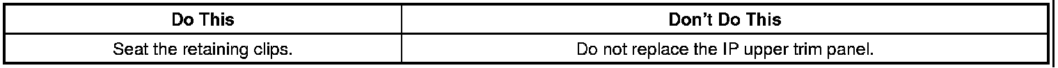 Remove the IP upper trim panel and seat the retaining clips using the steps below.