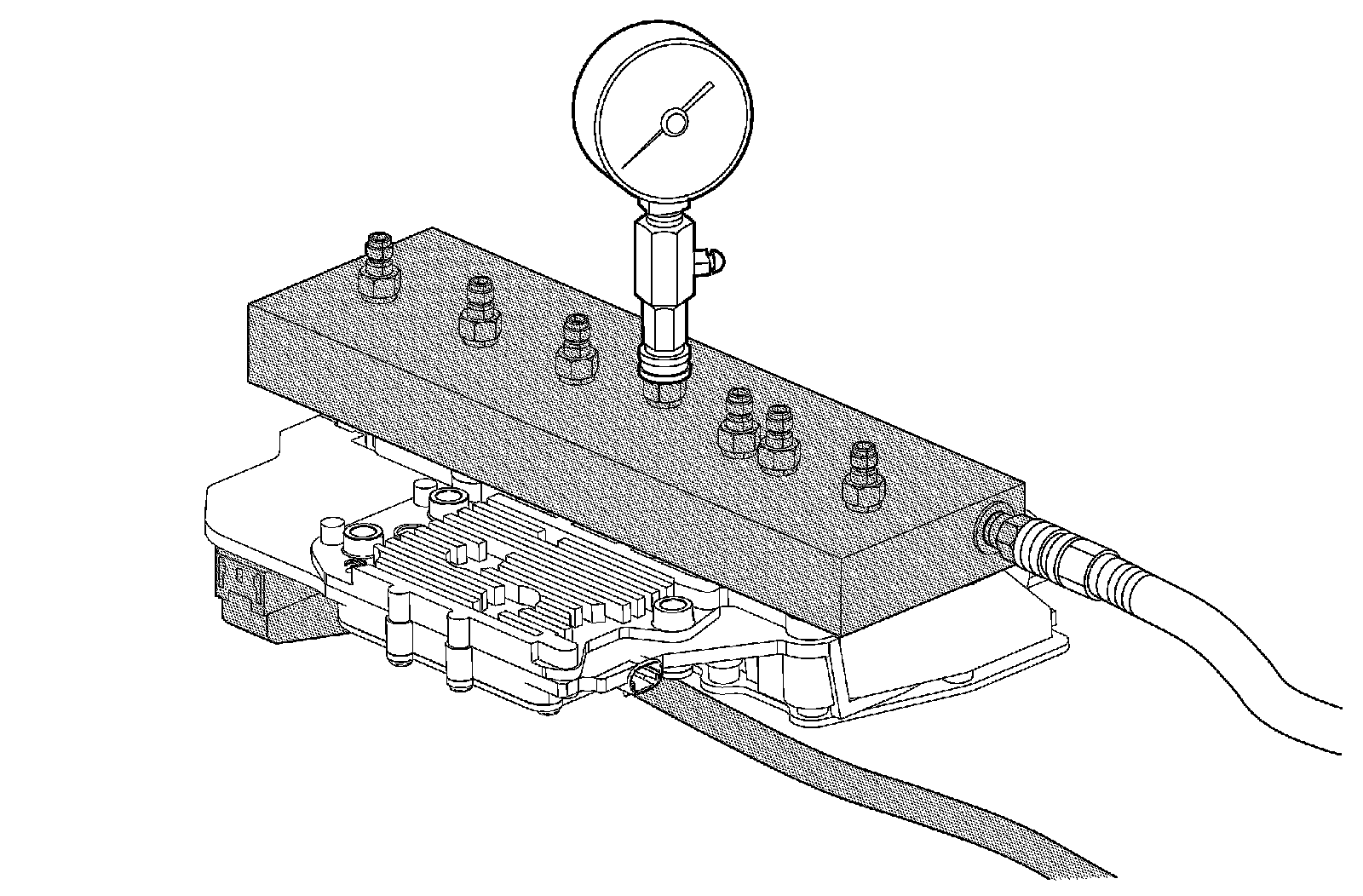 Note: Drain the TCM of excess transmission fluid before attaching to test block and use caution when attaching air to test block air inlet.