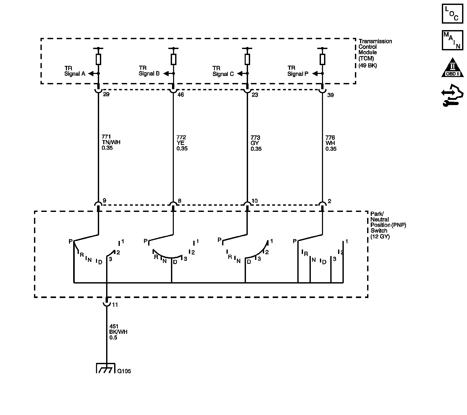 The transmission range (TR) switch is part of the park/neutral position (PNP) and back-up lamp switch assembly and is mounted on the transmission manual shaft. The TR switch is a multi-signal switch. The transmission control module (TCM) supplies ignition voltage to the TR switch on four signal circuits, A, B, C, and P. Each gear selector lever position grounds one or more of the signal circuits in a unique pattern. In order to determine the gear range selected by the driver, the TCM compares the voltage combination on the signal circuits to a TR switch combination table stored in memory.