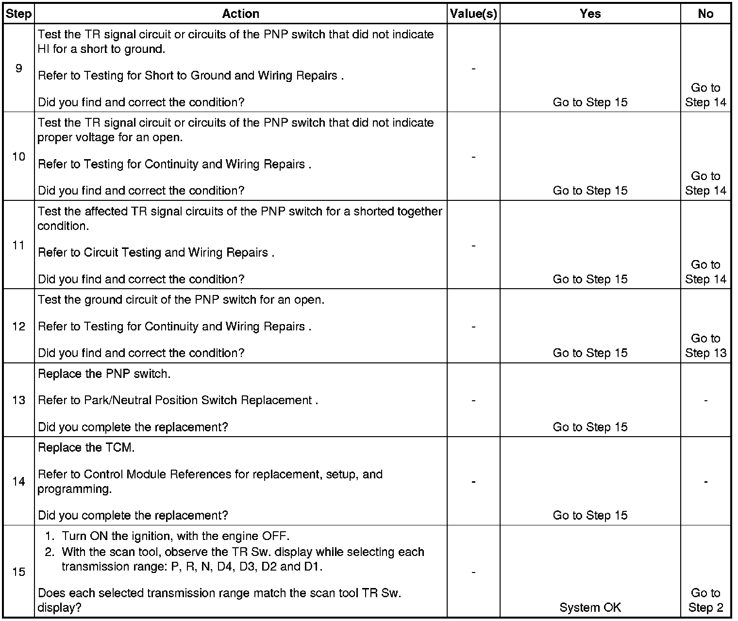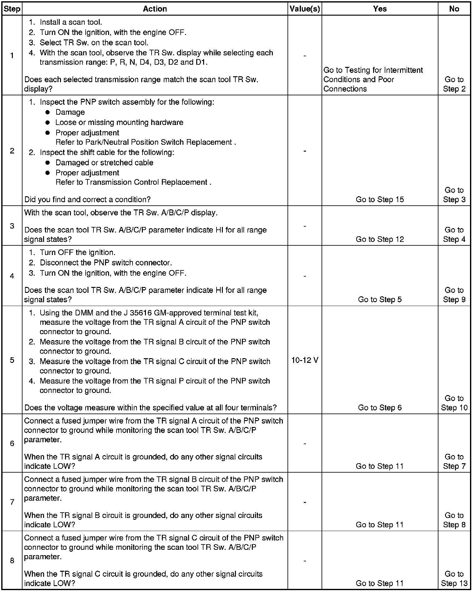 5. This step tests the TR switch wiring for an open or lack of signal voltage from the TCM.