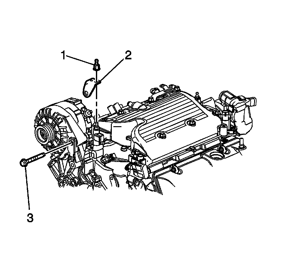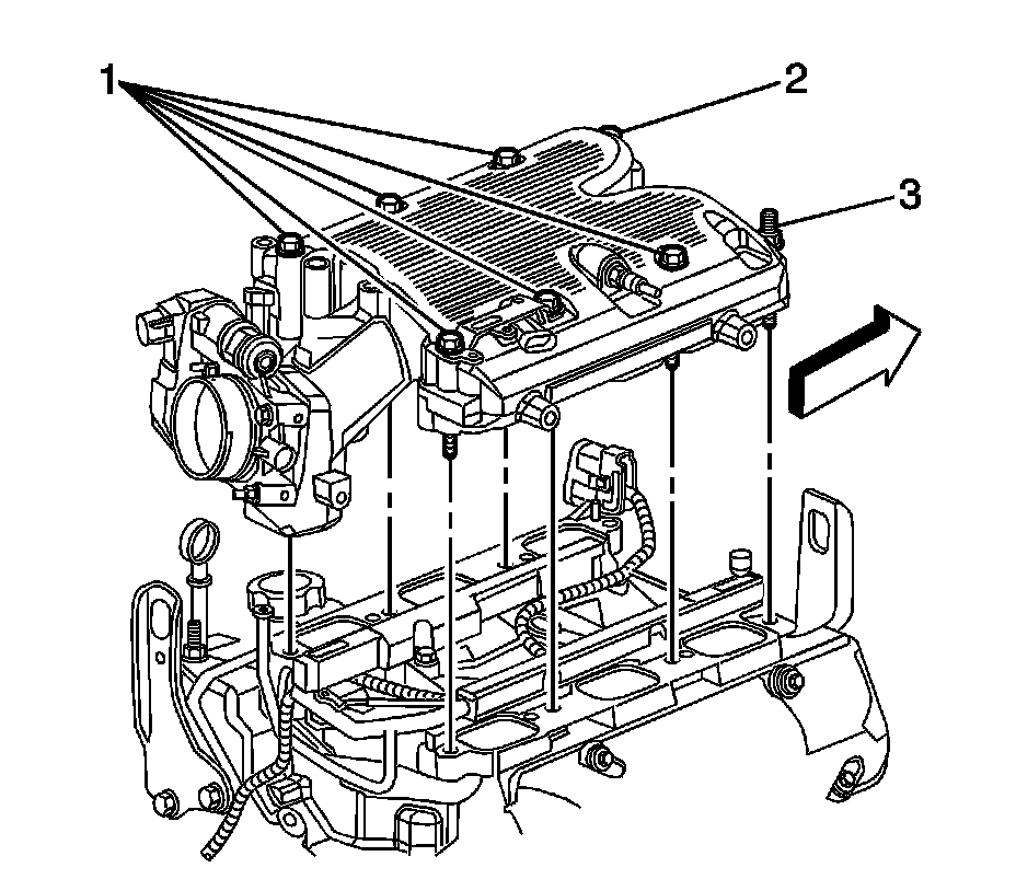 11. Install the upper intake manifold bolts (1, 2) and stud (3).