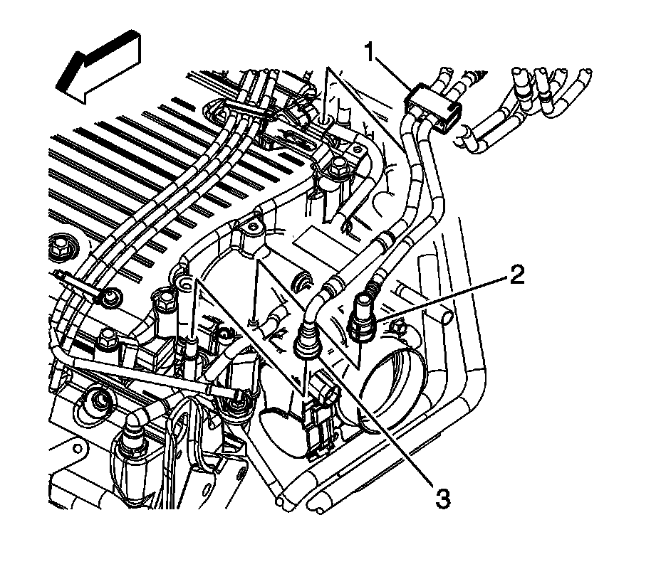 83. Disconnect the fuel feed line quick connect fitting (3) from the fuel rail. Refer to Metal Collar Quick Connect Fitting Service Metal Collar Quick Connect Fitting Service.