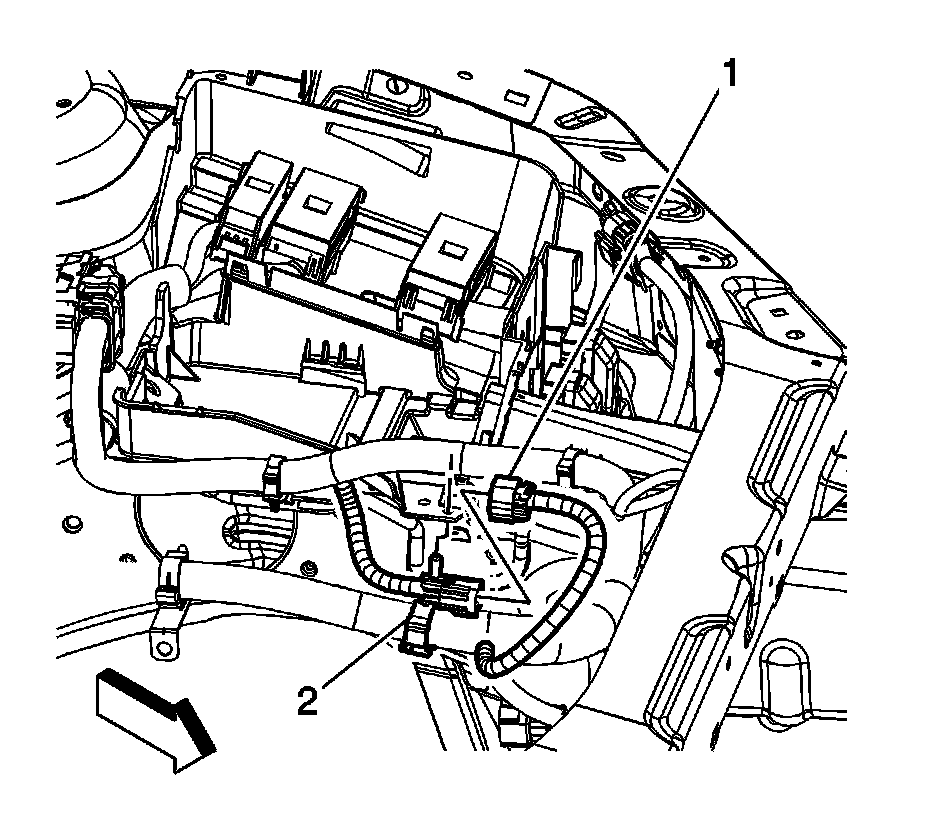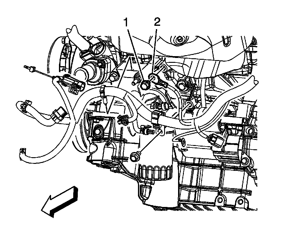 43. Remove the engine wiring harness clips (1, 2) from the ignition control module bracket.