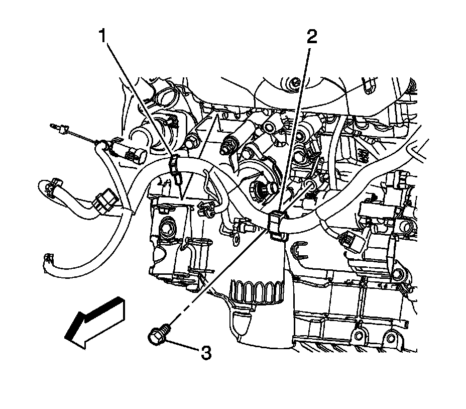 15. Remove the engine wiring harness clip bolt (3).