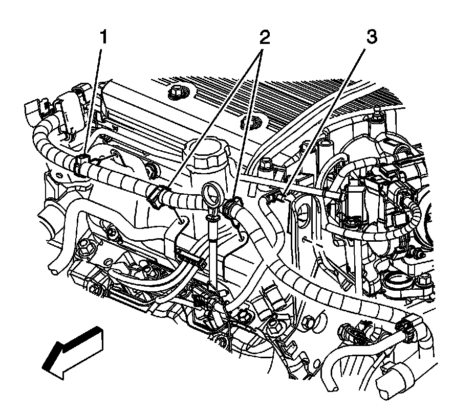 84. Disconnect the EVAP purge line quick connect fitting (2) from the canister purge solenoid. Refer to Plastic Collar Quick Connect Fitting Service Plastic Collar Quick Connect Fitting Service.