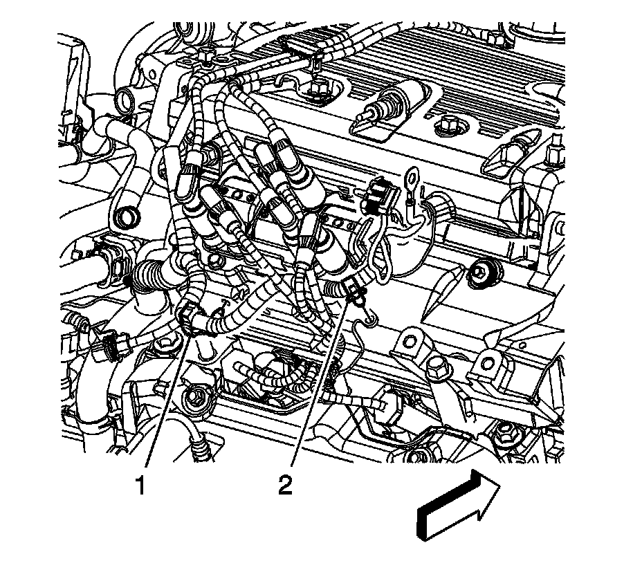 11. Disconnect the engine wiring harness electrical connector (2) from the knock sensor.