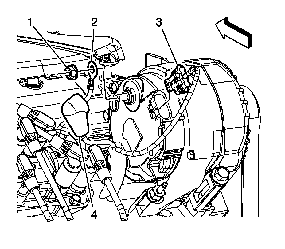 13. Separate the engine wiring harness ground terminal (2) from the engine boss.