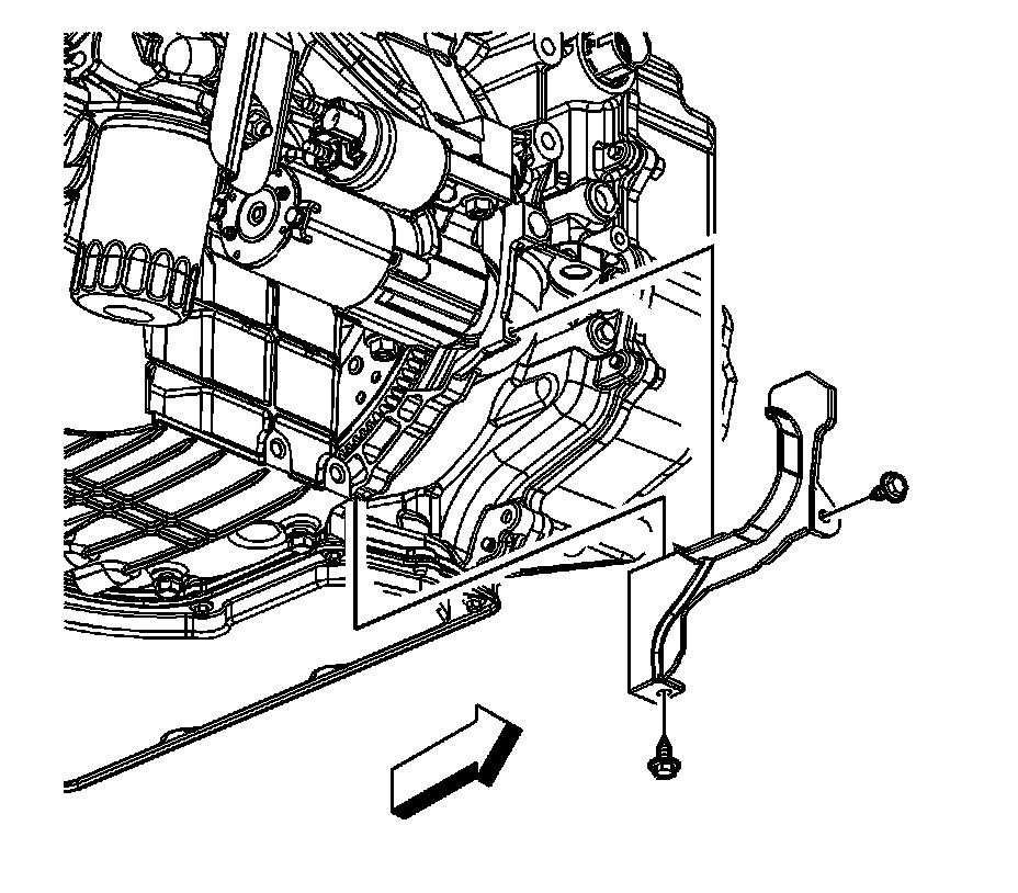 8. Remove the starter motor. Refer to Starter Replacement (LAT) Service and RepairStarter Replacement (LE5/LE9) Service and RepairStarter Replacement (LZ4 or LZE) Starter Replacement (LZ4 or LZE)Starter Replacement (LY7) Starter Replacement (LY7).