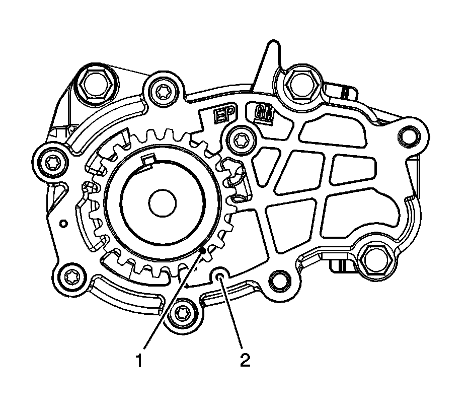 5. Ensure the crankshaft is in the stage one timing position with the crankshaft sprocket timing mark (1) aligned to the stage one timing mark on the oil pump cover (2) using the EN 46111. Refer to Timing Chain Alignment Diagram (Locations) - Stage One.