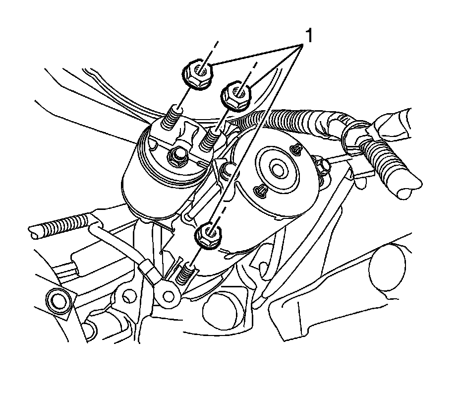 3. Remove the starter solenoid nut (1) to disconnect the starter harness.