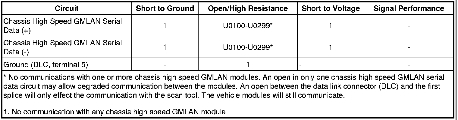 1. Attempt to communicate with all control modules on the high speed GMLAN serial data circuit. Refer to Data Link References (Initial Inspection and Diagnostic Overview). Communications should not be available with two or more control modules on the chassis high speed GMLAN serial data circuit.