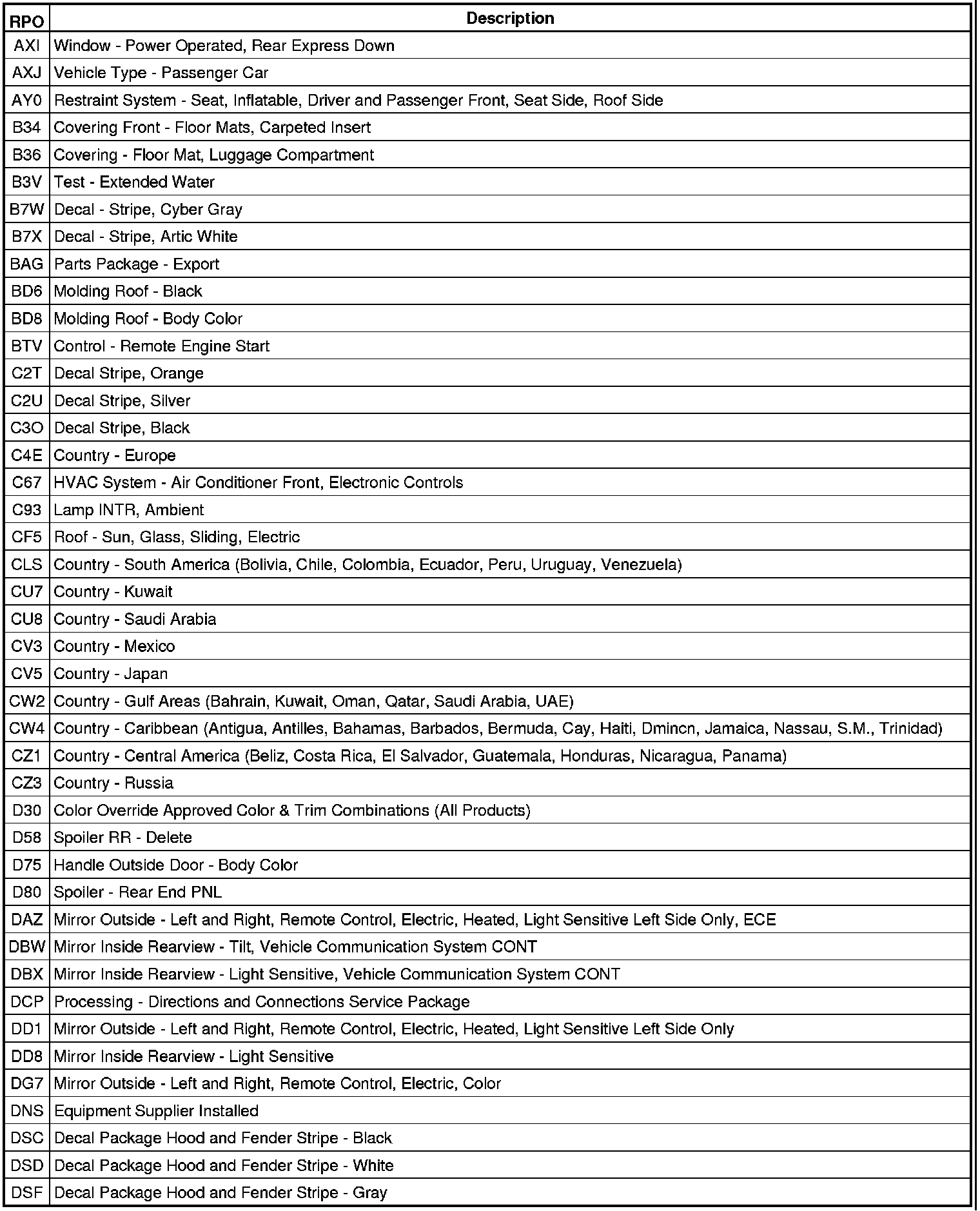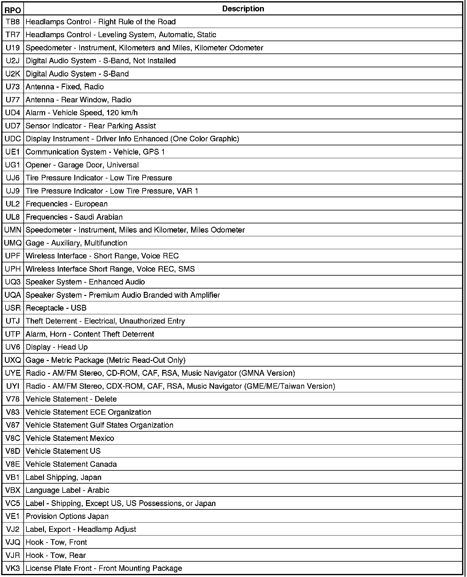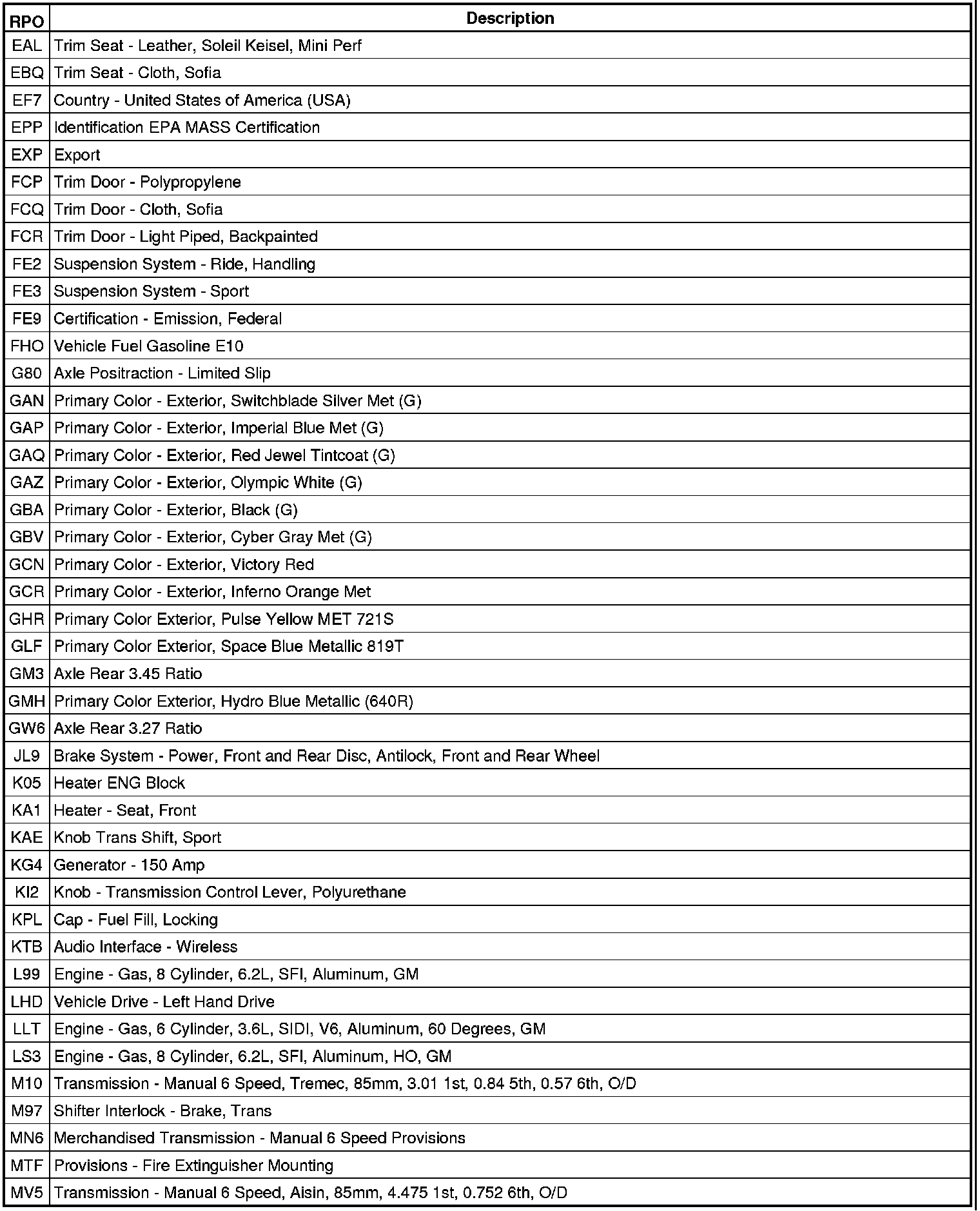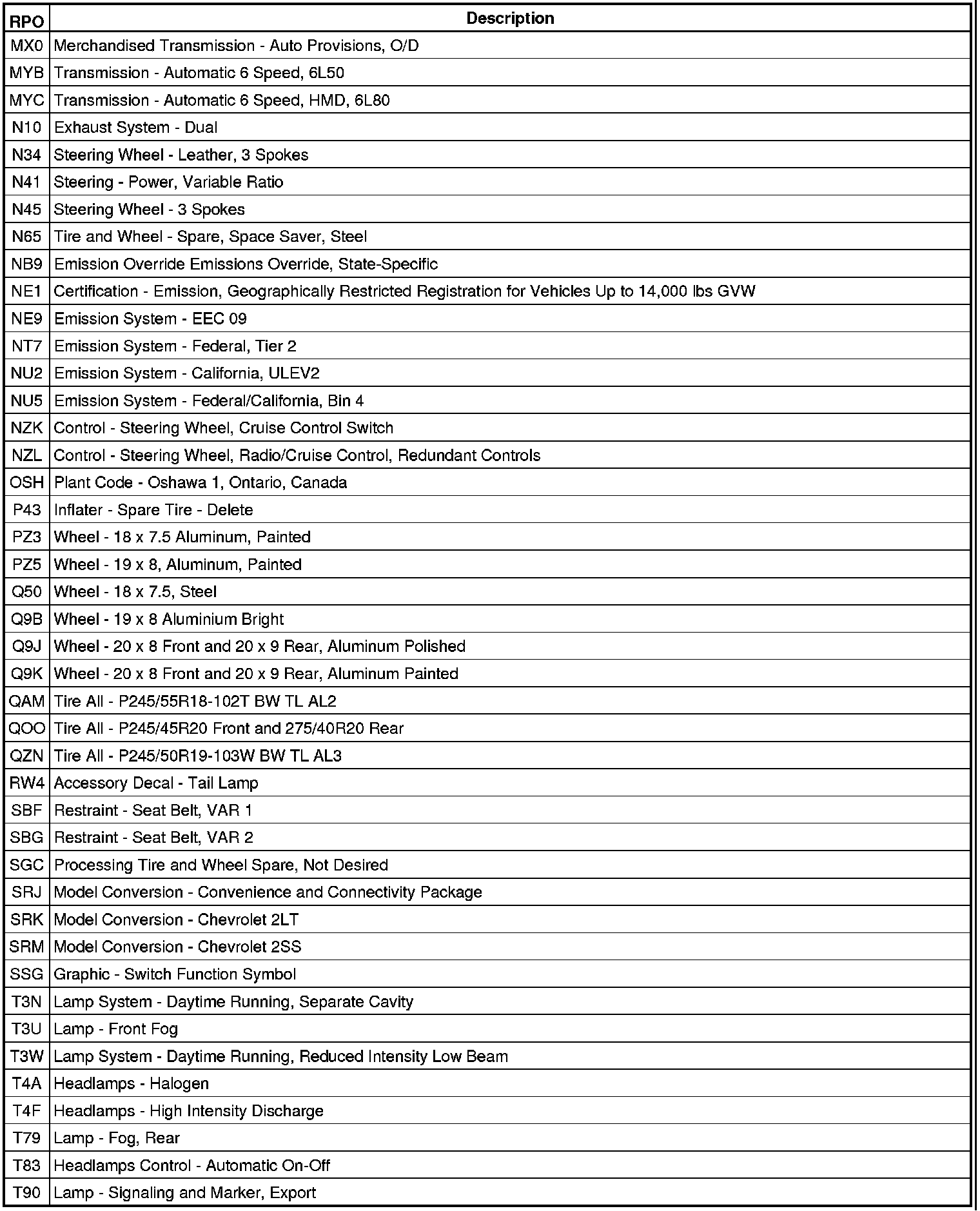 The following table provides the description of the RPO codes that are available on the vehicle. The vehicles RPO list is printed on the Service Parts Identification Label.