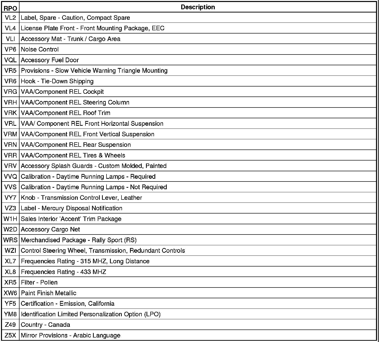 RPO Code List