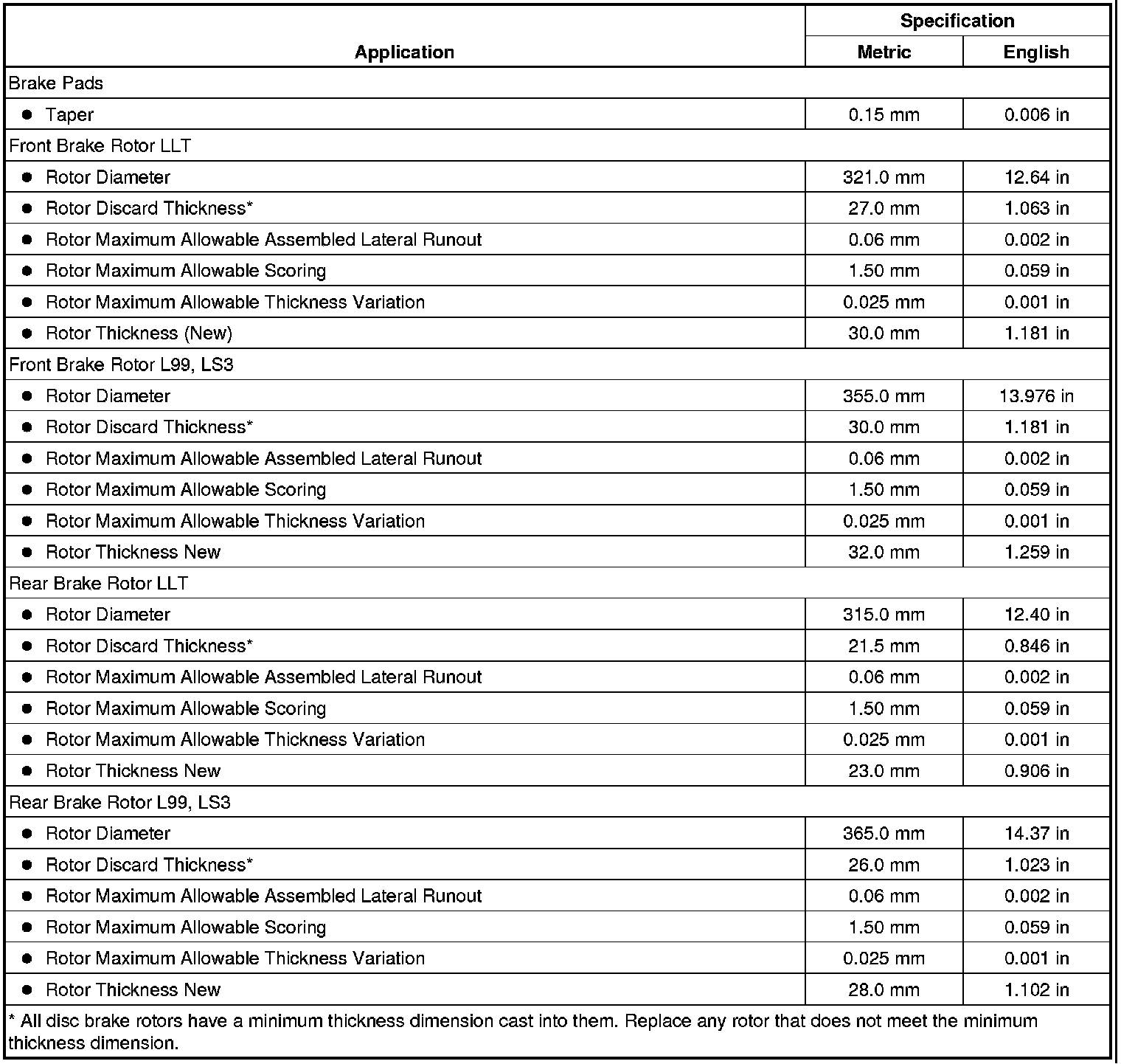 Disc Brake Component Specifications
