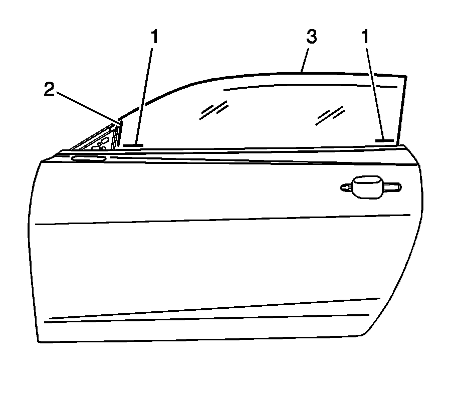 19. Locate the outer reveal belt seal (1) and mirror patch (2), mark the window (3) in 3 places for the initial window position before adjustments are performed. These marks will aid in positioning the window to the desired location during adjustment.