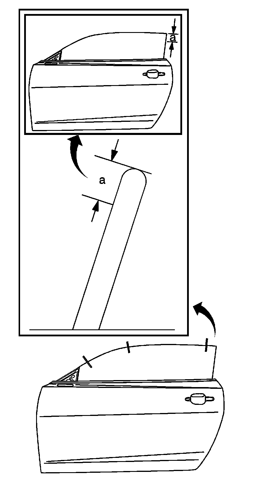 12. Measure the gap (a) between door window and the 1/4 window, at 2 locations. 10 mm (0.39 in) +/-1.5 mm (0.06 in) and parallel within 1.5 mm (0.060 in), go to the next step.