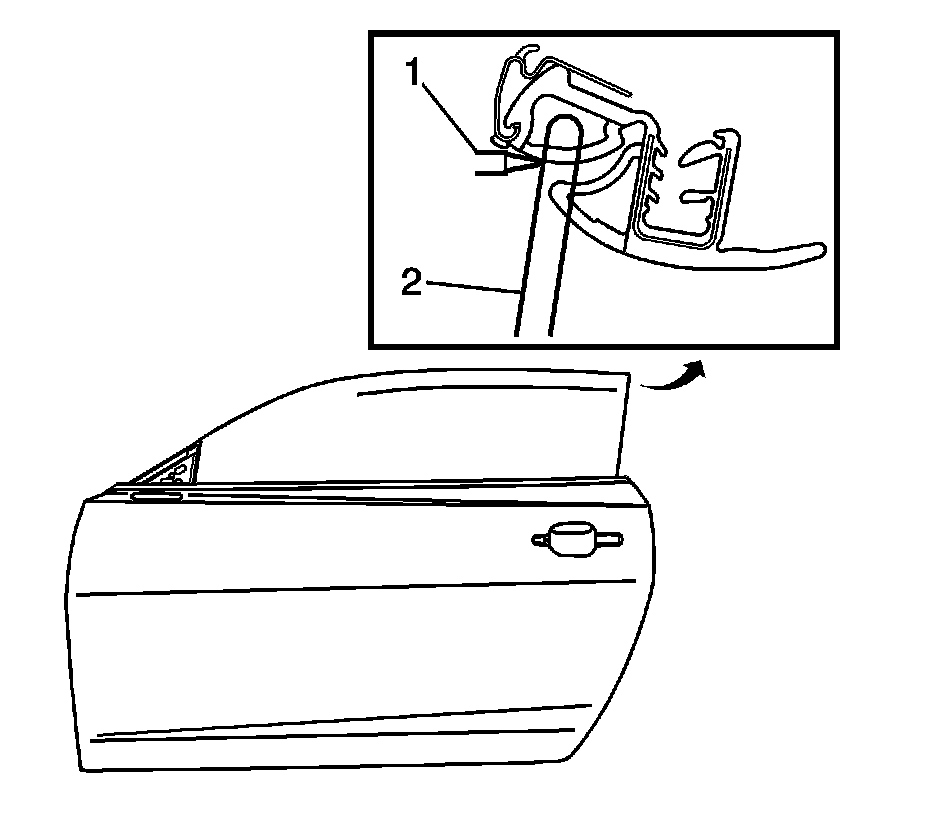 4. Using a long 80 mm (3.1 lb in) hand driver with a Torx T25 bit turn the set screw (2) a minimum of one full turn clockwise but no more then two full turns to raise rear of window approximately 1mm.