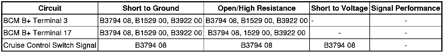 The cruise control switch is an input to the body control module (BCM). The BCM monitors the cruise control on/off, set/coast, resume/accelerate and cancel switches via the cruise control switch signal circuit in order to detect when the driver has requested to perform a cruise control function. The BCM detects a specific voltage signal on the cruise control switch signal circuit when a switch is applied. The BCM sends a serial data message to the ECM indicating the status of the cruise control switches.