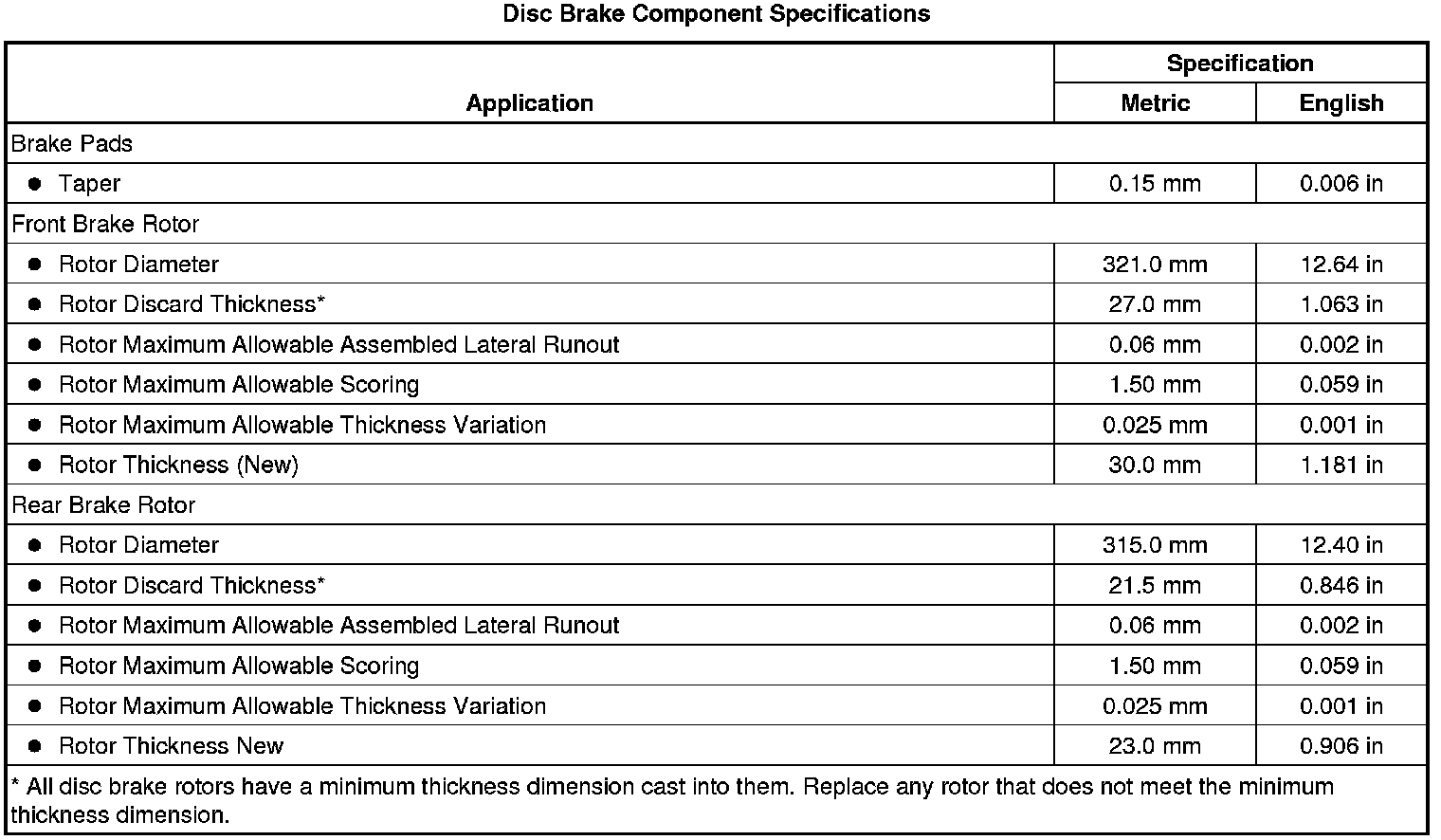 Disc Brake Component Specifications