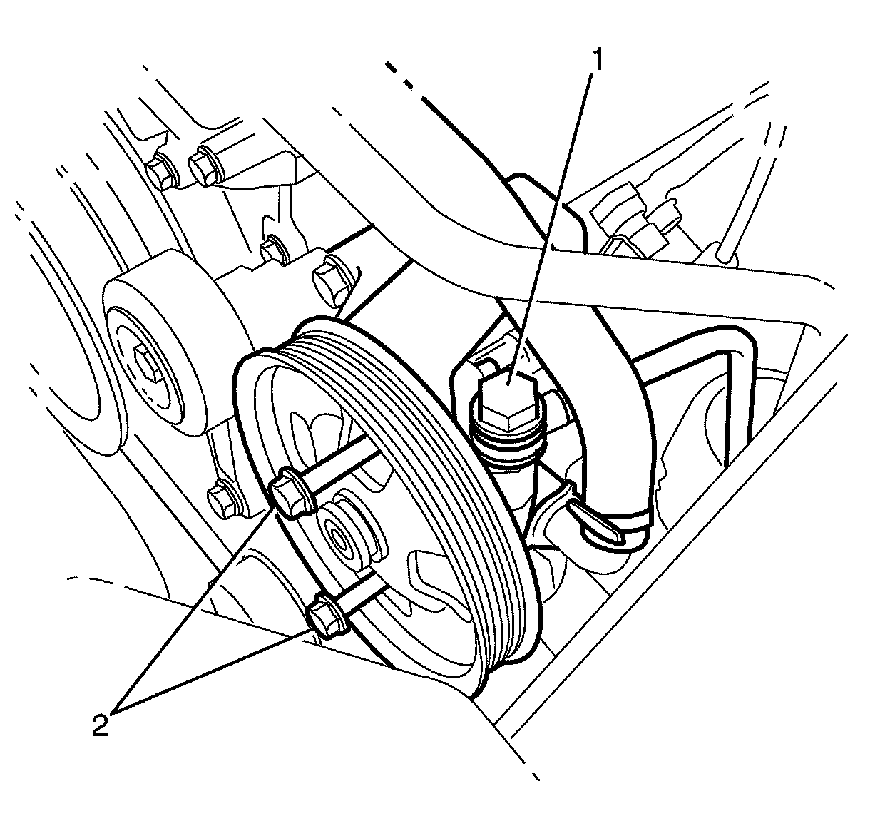7. Install the power steering pump to power steering pump bracket retaining bolts (2) and tighten to 30 Nm (22 lb ft).