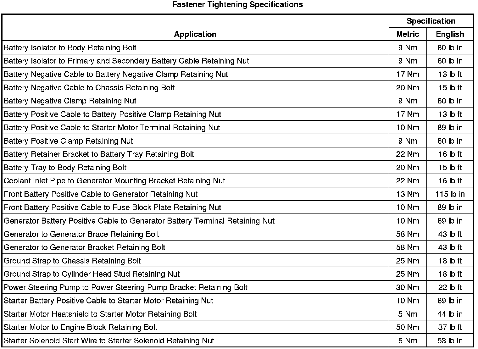 Fastener Tightening Specifications