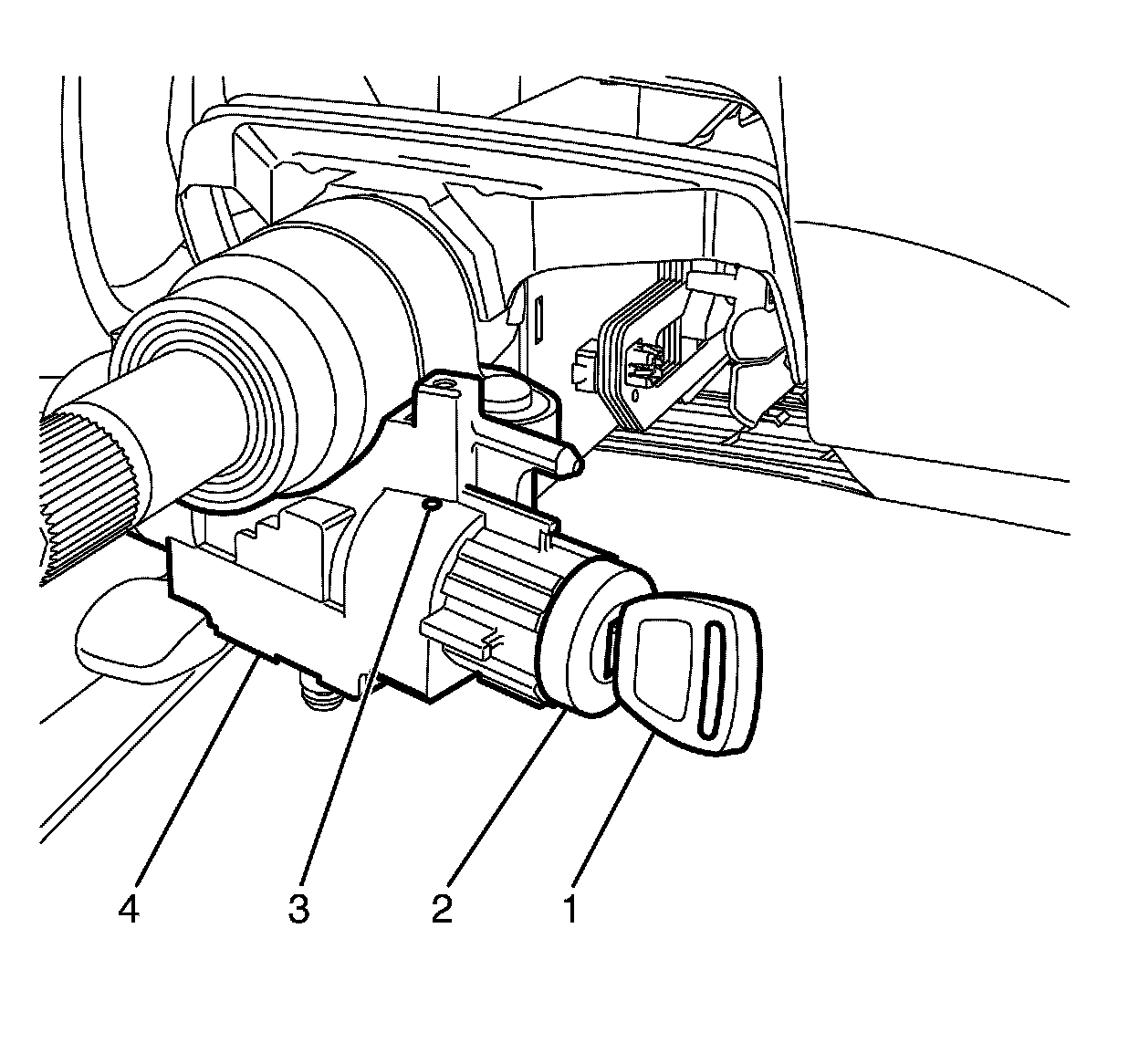 The ignition lock cylinder latch must fully engage and lock into the ignition lock cylinder housing (3).