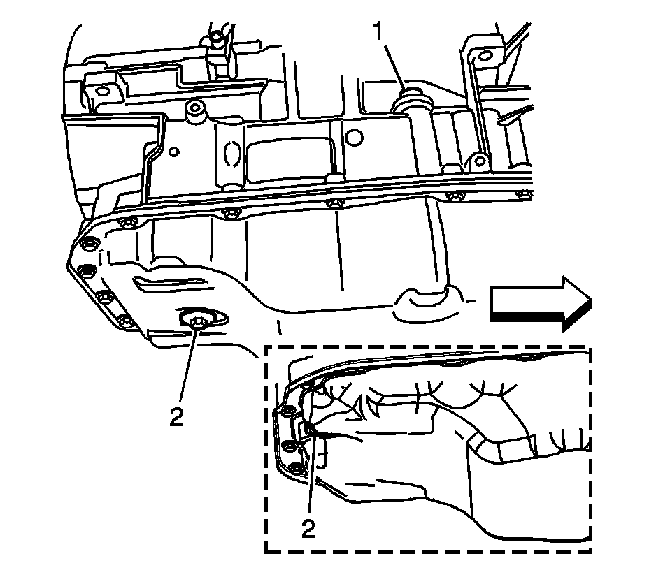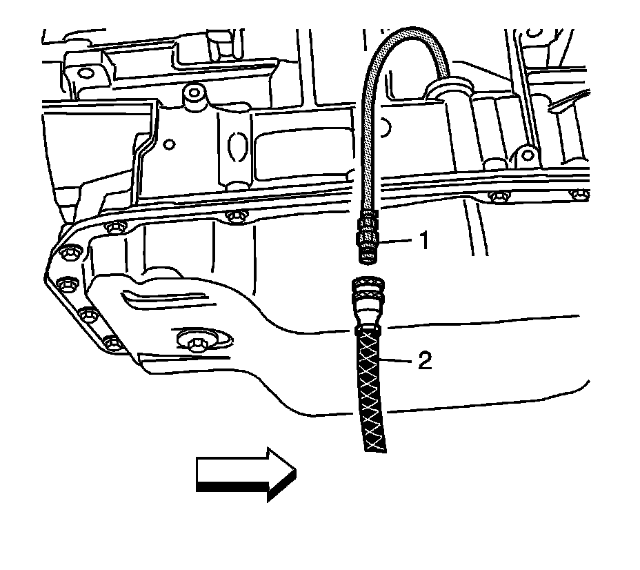 1. Perform this procedure for vehicles with transmissions that are not equipped with a fill tube and dipstick. Based on accessibility, transmission fluid may be added through the fluid fill tube plug assembly (1) hole or through the oil level check plug (2) hole in the bottom of the transmission fluid pan.