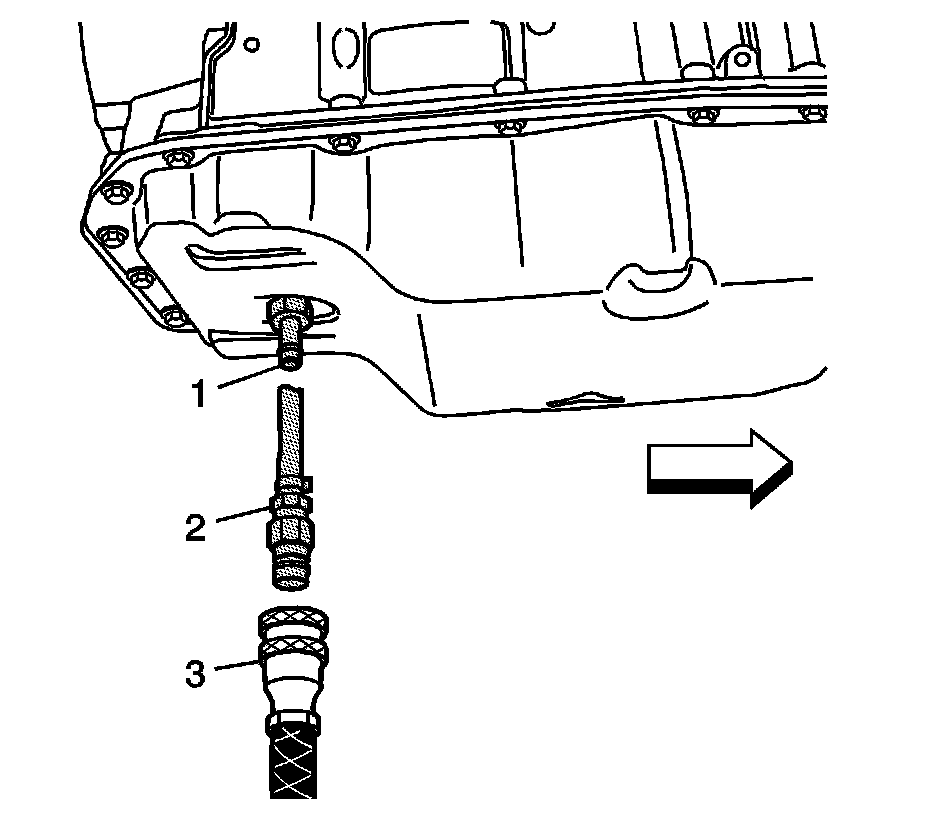 6. With the engine still running, remove the DT 47784 - fluid fill pan adapter (1), (2), and J 45096 - flush and flow test tool (3) and then check the fluid level. Refer to Transmission Fluid Level and Condition Check (Transmission Fluid Level and Condition Check).