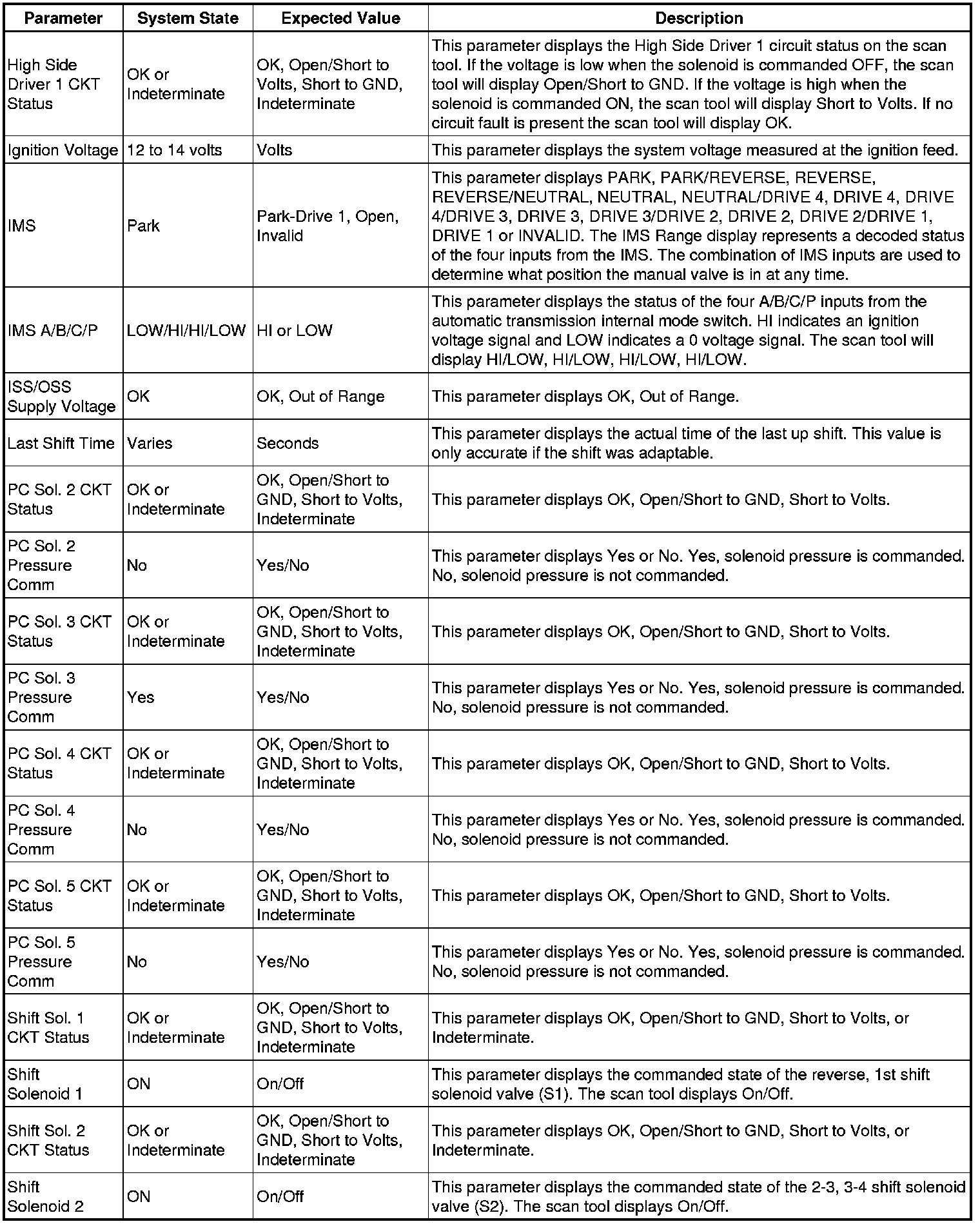 The Transmission Control Module Scan Tool Data List contains all transmission related parameters that are available on the scan tool. The list is arranged in alphabetical order. A given parameter may appear in any one of the data lists, and in some cases may appear more than once, or in more than one data list in order to group certain related parameters together.