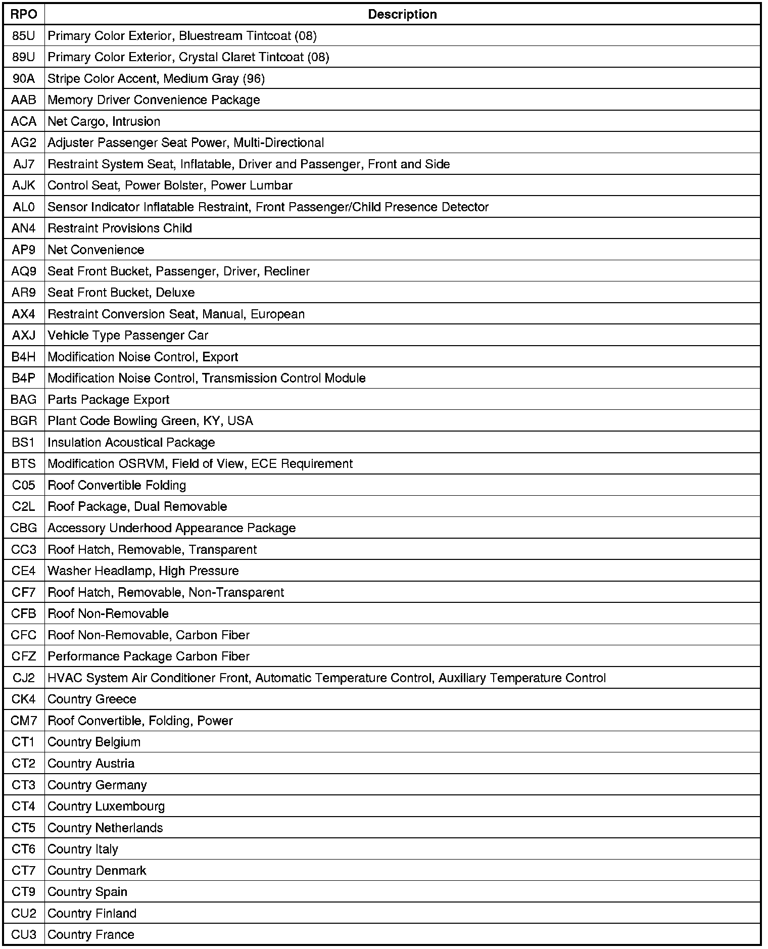 The following table provides the description of the Regular Production Option (RPO) codes that are available on the vehicle. The vehicle's RPO list is printed on the Service Parts Identification Label.